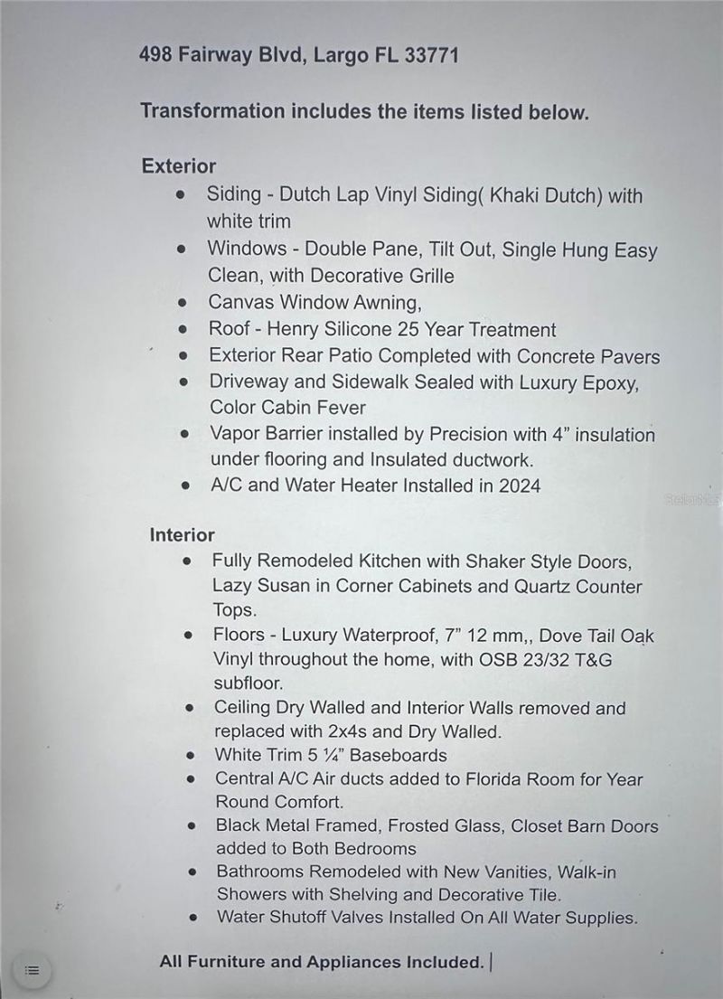 Welcome to Fairway Village, a sought after, resident owned (Share included), golf community is located 7 miles from the gulf and its beautiful white sandy beaches. This spacious, fully updated, one of a kind home definitely has the WOW factor. Every inch of this home has been renovated with Luxury, Quality Floors, Fixtures, Roof, Windows. NEW AC and Water Heater installed in 2024. Luxury Blinds, Vapor Barrier, Dry Wall and Ceilings make it a must see. A full list of the upgrades are included in the pictures. The OPEN living concept makes entertaining easy with a large sunny living room, kitchen with island seating, and a Florida Room with loads of natural light for the perfect entertaining space. The entire home is tastefully decorated showcasing a blend of style and functionality. The unique charm of this home features an oversized bedroom floor plan, offering an ideal layout for families and guests. The bathrooms have plenty of built-ins, are fully remodeledand showcase a walk-in shower, new vanity, and an abundance of storage space. The low HOA fee of $420 a month, includes your wifi, cable, water, sewer and maintenance of the club house and amenities as well as the golf course and all lawn care. You really get a feeling of spaciousness with our wide curbed streets with street lights and sidewalks. Amenities include: A private 9 hole par 3 golf course with two lakefront fairways and a practice putting green A five-plus acre lake for catch and release fishing Two swimming pools with hot tubs and Eight sheltered shuffleboard courts. A new 19,000+ sq. ft. Clubhouse was completed January, 2022, that includes the following: 700 seat Auditorium/Ballroom, Large commercial kitchen, Stage for live music, comedy shows and other entertainment, Separate conference rooms, Fitness center, Library, Billiard room, Card playing room, Sitting areas, Wi-fi service throughout. 2026 Annual Golf memberships are available to residents for unlimited play. Non-members pay a $15 greens fee during season and $8 off season. The Fairway Village Social Committee (FSC) promotes and coordinates over 50 social activities. While the listing information is deemed reliable, please note, it is not guaranteed and should be independently verified for accuracy. Room sizes are estimates. Buyer and Buyer's Agent to verify dimensions. Do not submit offers via Dotloop.